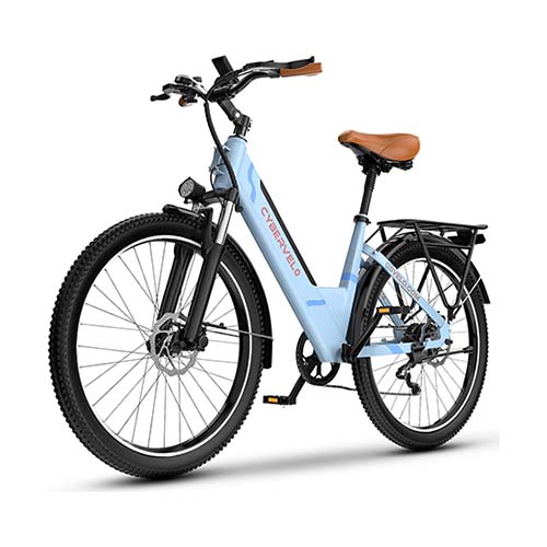 The Cybervelo Taluscondor EK2 is a practical electric commuter bike designed for everyday errands, neighborhood rides, and casual commuting. Its low step-thru frame makes getting on and off simple and safe, while the 26″ wheels, puncture-resistant tires, and front suspension deliver a stable, comfortable ride on pavement or light uneven surfaces.